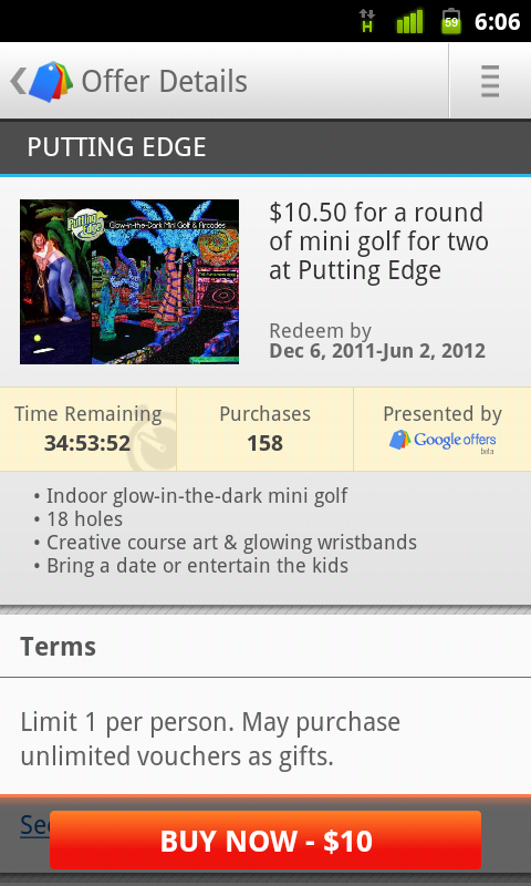 Google Offers is an app that gives you daily deals to nearby businesses, being restaurants, sporting goods shops, cupcake shops, flower shops, golf courses, sky diving, petting zoos, you pretty much get the idea. Google Offers has introduced me to so many places around Los Angeles that I never would of thought of going. You actually save money with Google Offers, unlike clipping the 25% Off coupons that come in the mail.